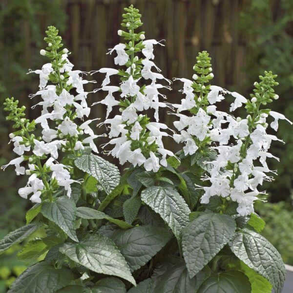 Tidlig, lav blomstersalvie i det reneste hvitt. Blomstrer rikt hele sommeren. Utmerket plante for pollinerende sommerfugler og bier. Kompakt, forgrenet vekst til potter, blomsterbed og samplantinger.