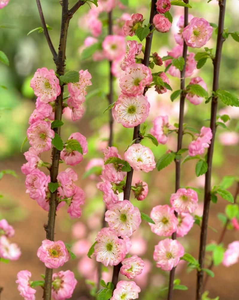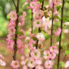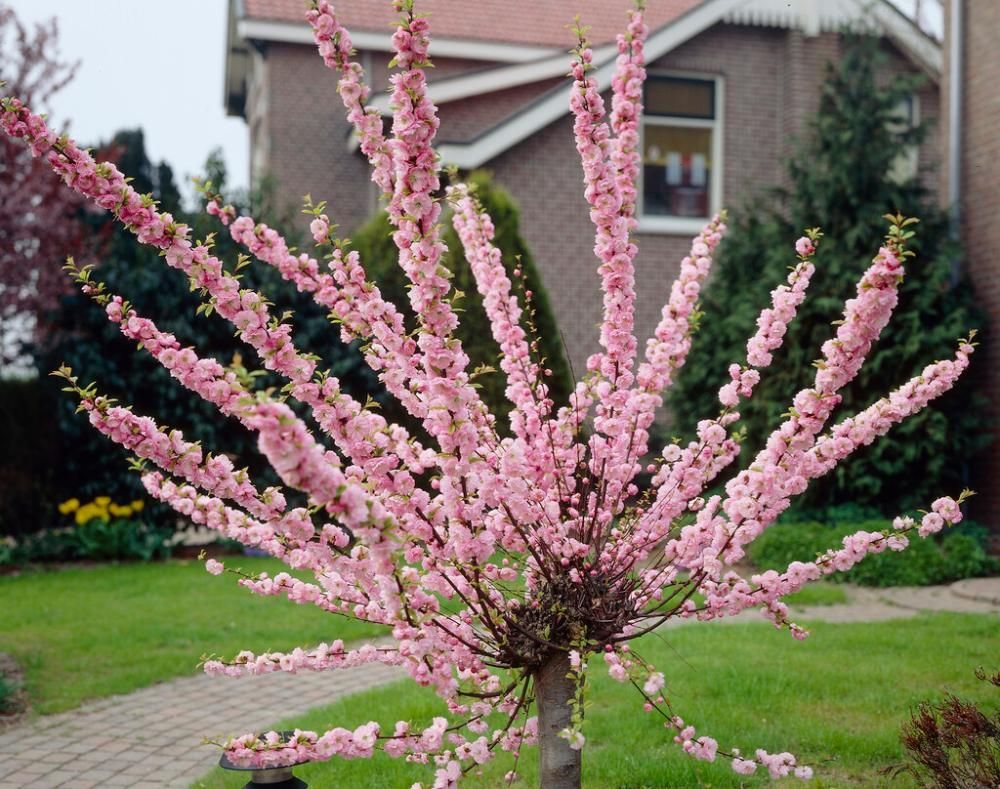 April–mai (varierer) med tett sky av rosa, fylte blomster på bar kvist. Et lyst, humle- og bievennlig vårtegn. Frukter er ubetydelige i prydsammenheng.