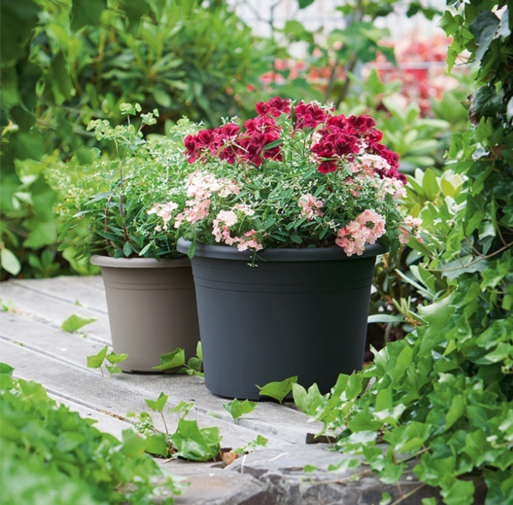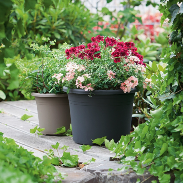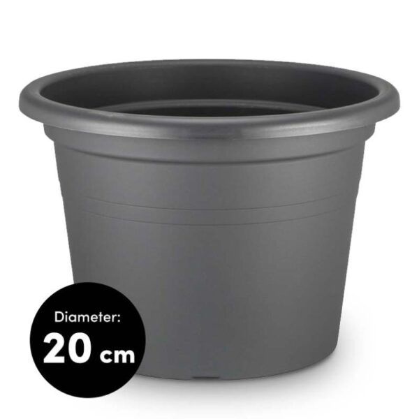 Antrasittfarget, rund potte i resirkulert plast med dreneringshull. En prisgunstig potte som passer både innendørs og utendørs med underskål.