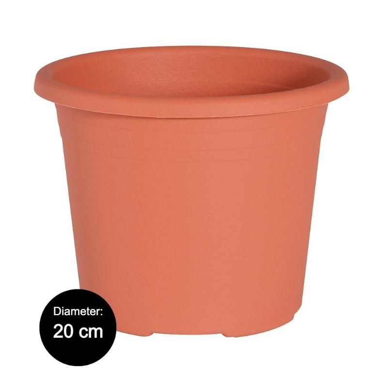 Terracotta-farget, rund potte i resirkulert plast med dreneringshull. En prisgunstig potte som passer både innendørs og utendørs med underskål.