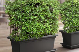 I denne pakken kommer plantekassen sammen med underskål,plantestøtte med komplett selvvanningssystem og hjul for enkel forflytning.
