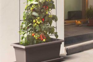 I denne pakken kommer plantekassen sammen med underskål,plantestøtte med komplett selvvanningssystem og hjul for enkel forflytning.