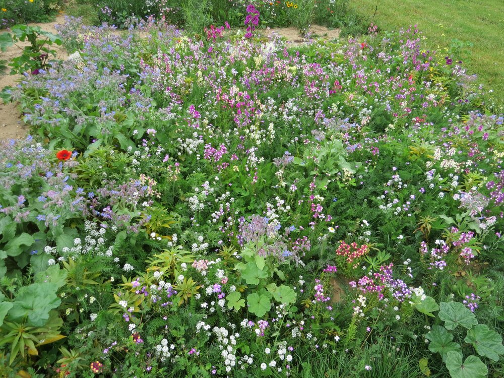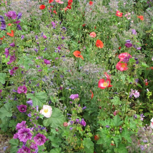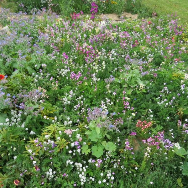 Aquilegia vulgaris (akeleie) og delphinium consolida tilfører høyde og struktur, mens lobelia erinus og lobularia maritima gir lavtvoksende fargeinnslag som fyller ut rommet. Blomster som malva moschata og myosotis alpestris (forglemmegei) gir et mykt og delikat preg, perfekt for et skyggefullt bed. Impatiens balsamina tilfører både farge og frodighet, og trives i områder med fuktig jord og lite sol.
