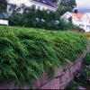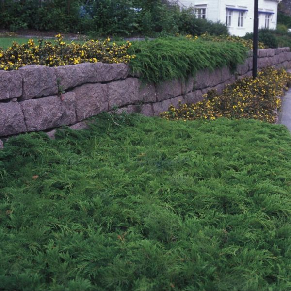 Plant på pottenivå. Avstand 60–100 cm for rask lukking. Løsne jorden bredt, vann inn og legg 5–8 cm bark/grus. På murkrone: sørg for dyp jordlomme og drenering. I skråning kan kokosnett brukes første sesong til røttene låser jorda.