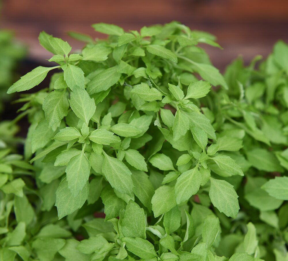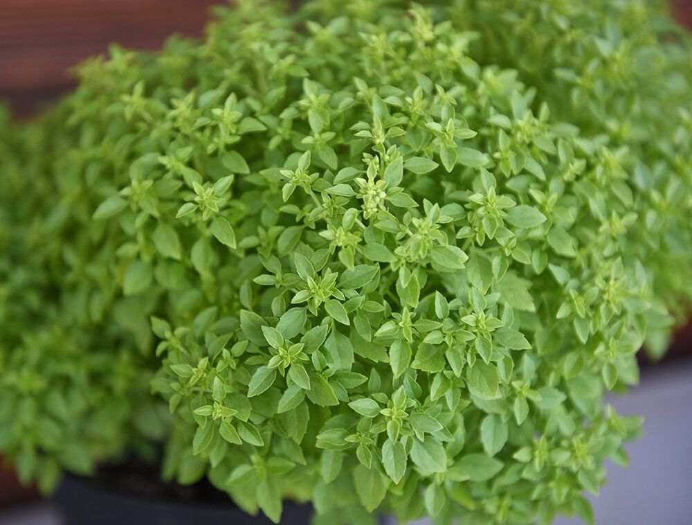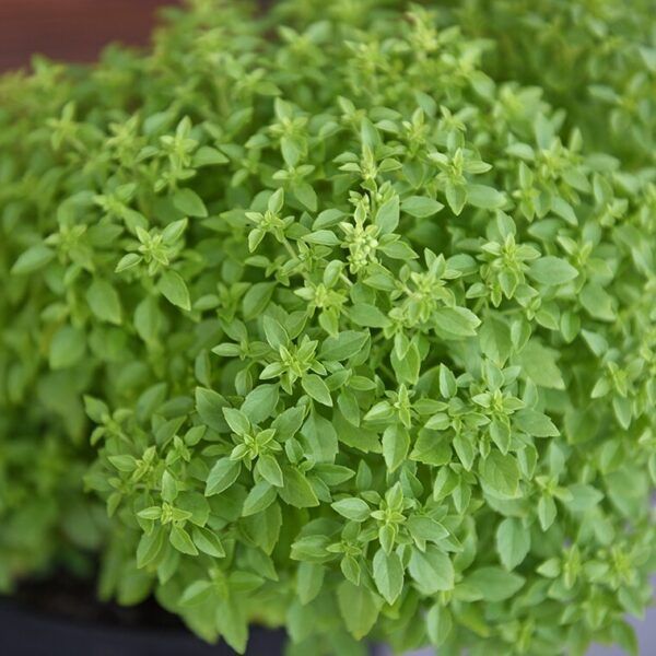 Piccolo-basilikum. Svært småbladet sort med søt, pikant, krydret smak. Ekstra lang høsteperiode om høsten. Velegnet for dyrking i potter utendørs.