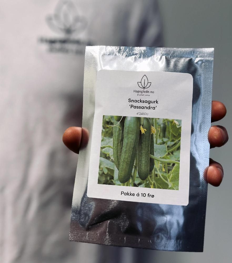 Cucumis sativus 'Passandra'Få en rik avling av sprø, smakfulle snacksagurker med ‘Passandra’! Denne selvbestøvende F1-hybriden gir jevne, mørkegrønne agurker med tynn skall og en frisk, saftig smak. Perfekt til salater, snacks og smørbrød. Egner seg godt for både drivhus og utendørs dyrking i lune områder.