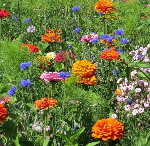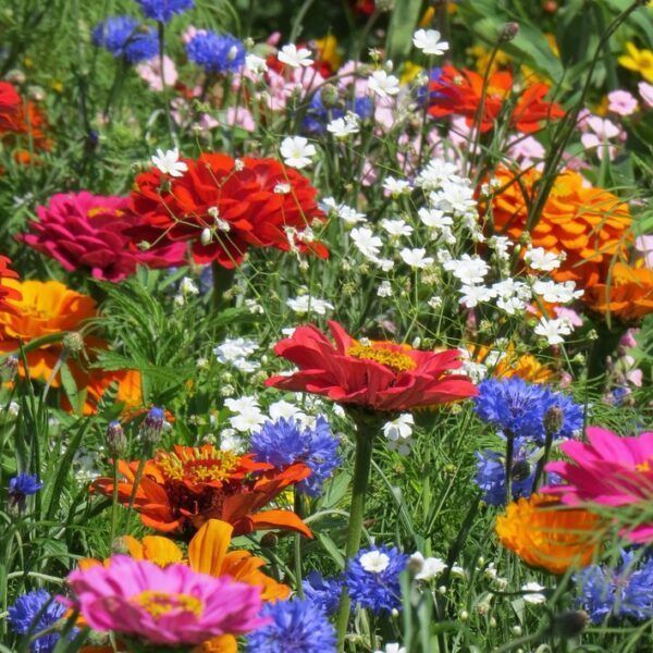 Blomster som calendula officinalis (ringblomst), lavatera og rudbeckia hirta tilfører strålende farger, mens helichrysum bracteatum (evighetsblomst) gir blomster som også kan tørkes og brukes til dekorasjon utover sesongen. Centaurea cyanus (kornblomst) og delphinium consolida tilfører vertikale elementer, mens tagetes erecta gir varme, gyldne toner.