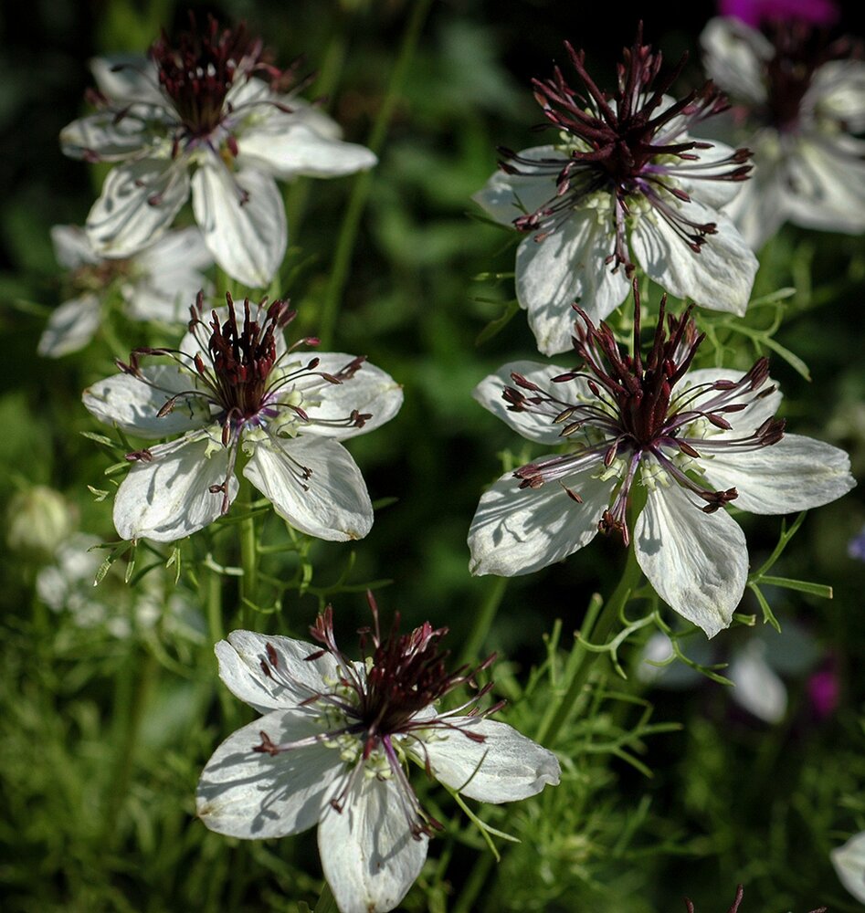Store, hvite blomster med mørk purpursvart midt og sirlige stenderbuketter som likner edderkopper. Senere kommer de mørke, fine frøkapslene. Både blomster og frøkapsler er svært dekorative, også i tørkede oppsatser.