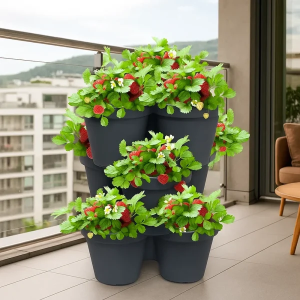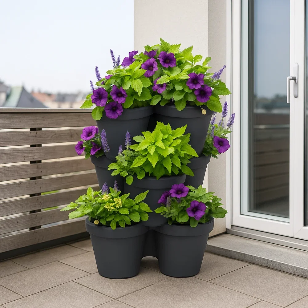Dekorative, stablebare trippelpotter i antrasittfarge laget av 90 % resirkulert materiale. Perfekt for dyrking av urter, blomster eller jordbær. Passer både inne og ute. Pris er for én etasje.