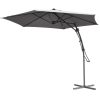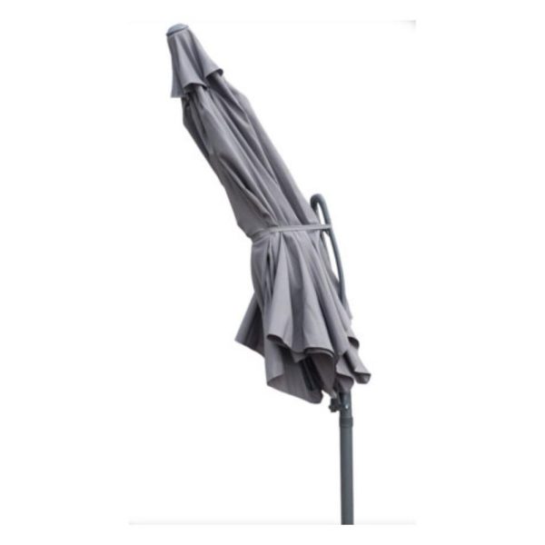 Parasollen er laget av slitesterke materialer som tåler både sol og regn. Den har en robust aluminiumsmast og et UV-bestandig polyesterstoff. Parasollet er enkelt å montere og demontere, og den har en praktisk base som kan fylles med vann eller sand for stabilitet.