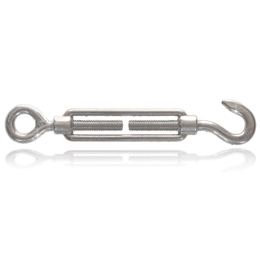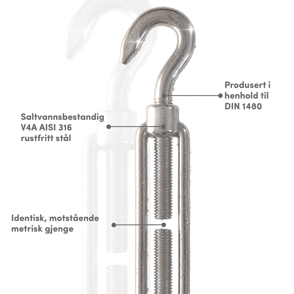 Denne strekkfisken i syrefast rustfritt stål (DIN 1480) brukes for å stramme og justere spennet i wirebaserte systemer, som espalier og klatrestøtter. Modellen har krok i den ene enden og øye i den andre, noe som gjør den svært allsidig og enkel å montere på vegg, stolpe eller festeanordning.