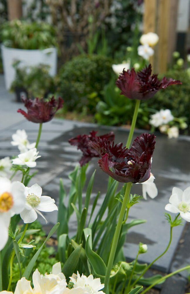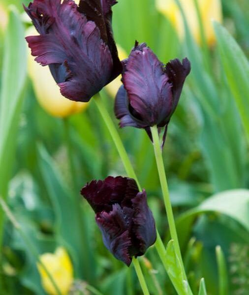 Tulipan ‘Black Parrot’ tilhører gruppen med papegøyetulipaner. Tulipangruppen med de fargerike og fjæraktige kronbladene har fått navet papegøye-tulipan, og er krysninger av flere forskjellige sentblomstrende triumftulipaner. Når solen er på sitt sterkeste kan det se ut som kronbladene legger seg helt ut og blomsten blir nesten helt flat. Tulipanene fremstår grønne helt til de er i slutten av vekstfasen og de fantastiske fargene avsløres når blomsten åpner seg.
