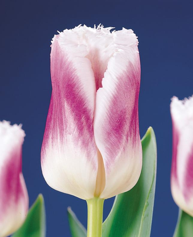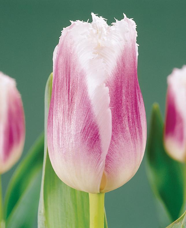 Tulipa 'Siesta'Blomster i en dyp rosa, nesten lilla farge. De pur hvite frynsete kantene står i flott kontrast mot det lilla-rosa.