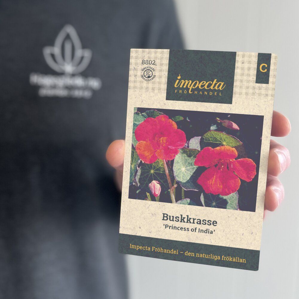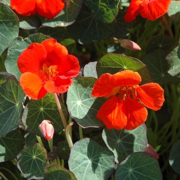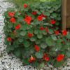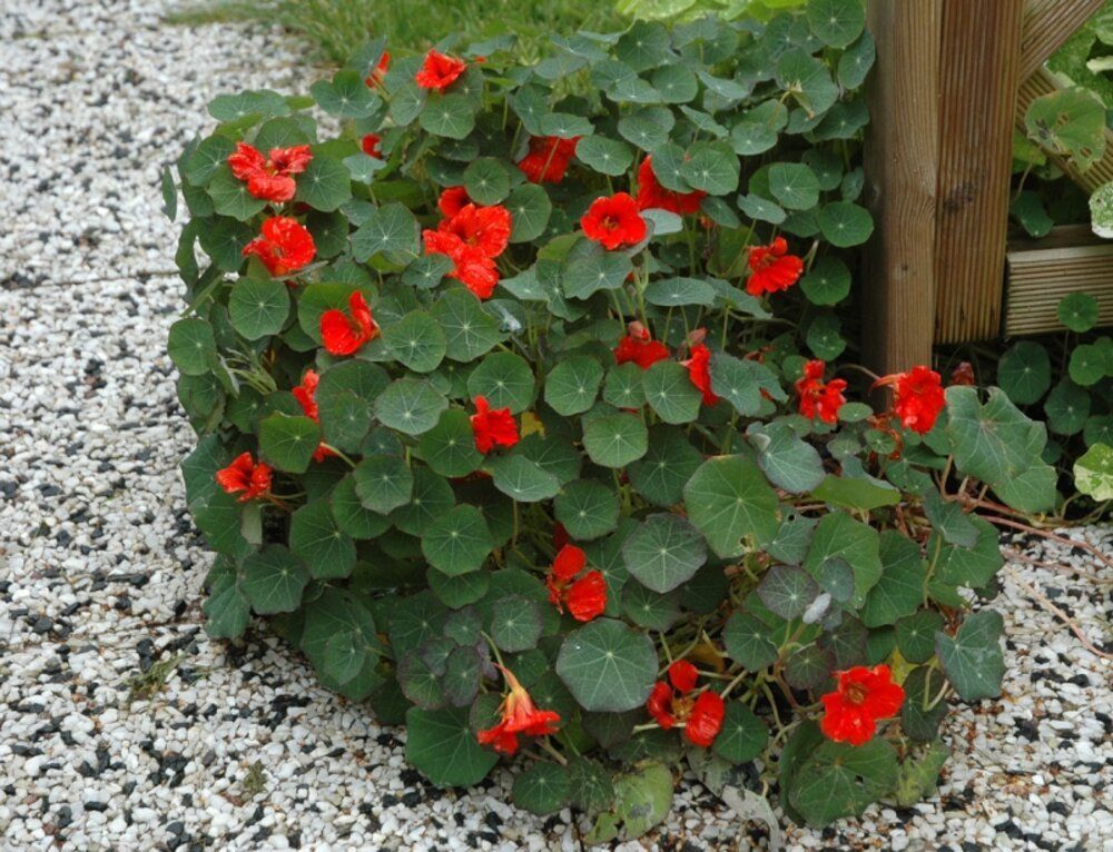 Indisk karse. Sjarmerende, lavtvoksende blomkarse med mørkegrønt bladverk og blomster i lysende skarlagenrødt. Svært søt i potter og bedkanter. Blomster og blader er spiselige og kan brukes i salater, som dekorasjon m.m.