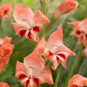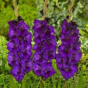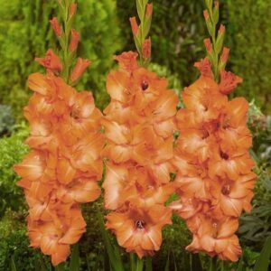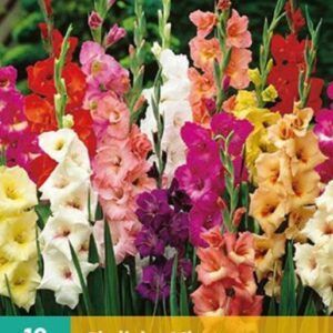 Plantes godt ned i jorden (ca 12-14 cm.) så den ikke tipper overende! Gladioler (gladiolus) er flotte, ofte høye, blomster som gir høyde og struktur i bedd. Blir normalt 75 til 120 cm høye. Blomstrer fra juli til oktober. Lange stilker, som regel med traktformede blomster. Stilkene er tykke og har blomster på den ene siden.